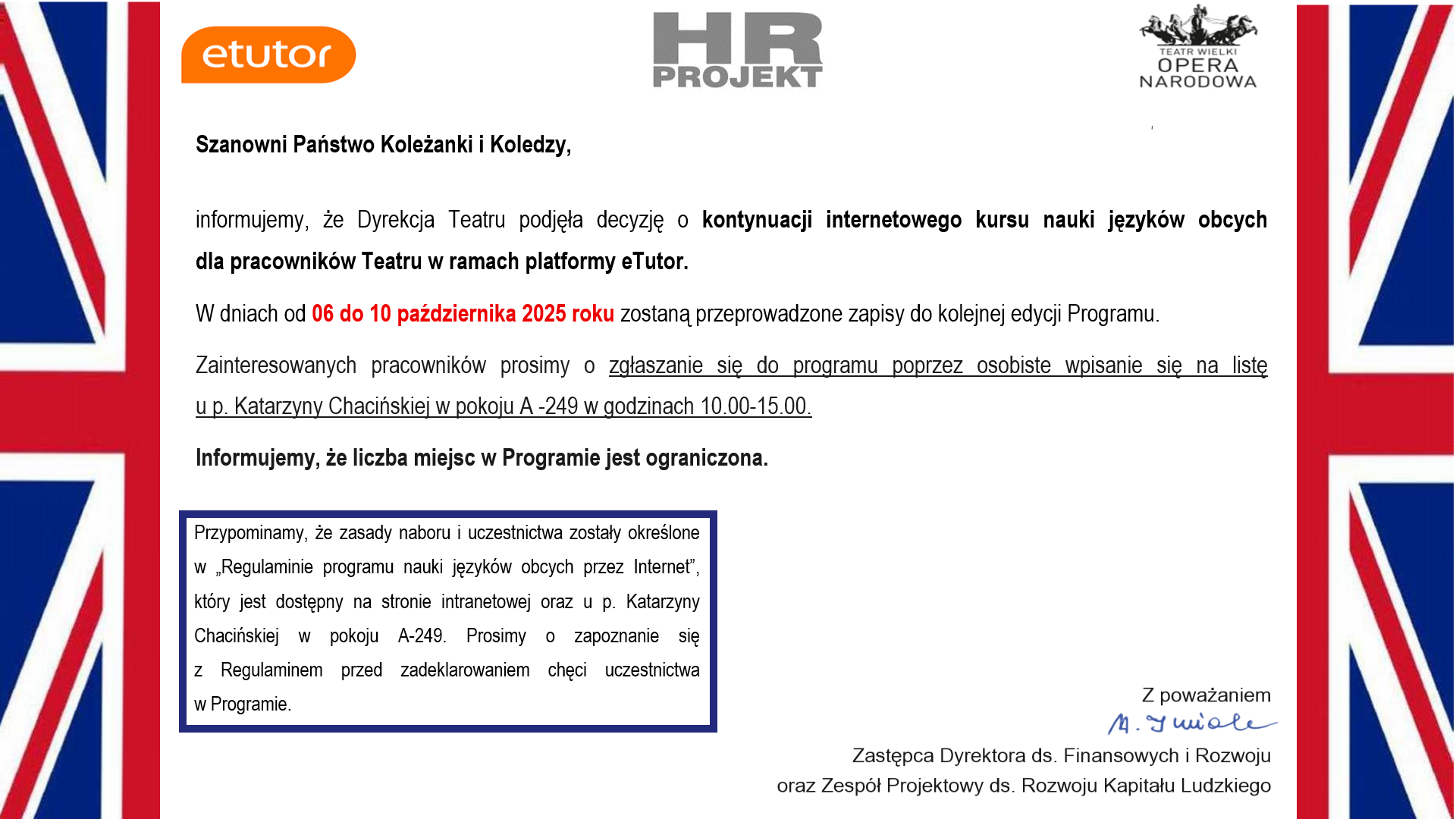 Dyrekcja Teatru podjęła decyzję o kontynuacji internetowego kursu nauki języków obcych dla pracowników Teatru w ramach platformy eTutor. W dniach od 14 do 23 października 2024 roku zostaną przeprowadzone zapisy do kolejnej edycji Programu. Zainteresowanych pracowników prosimy o zgłaszanie się do programu poprzez osobiste wpisanie się na listę u p. Katarzyny Chacińskiej w pokoju A -249 w godzinach 10.00-15.00. Zasady naboru i uczestnictwa zostały określone w Regulaminie programu nauki języków obcych przez Internet Liczba miejsc w Programie jest ograniczona. | 23.X.2024 |