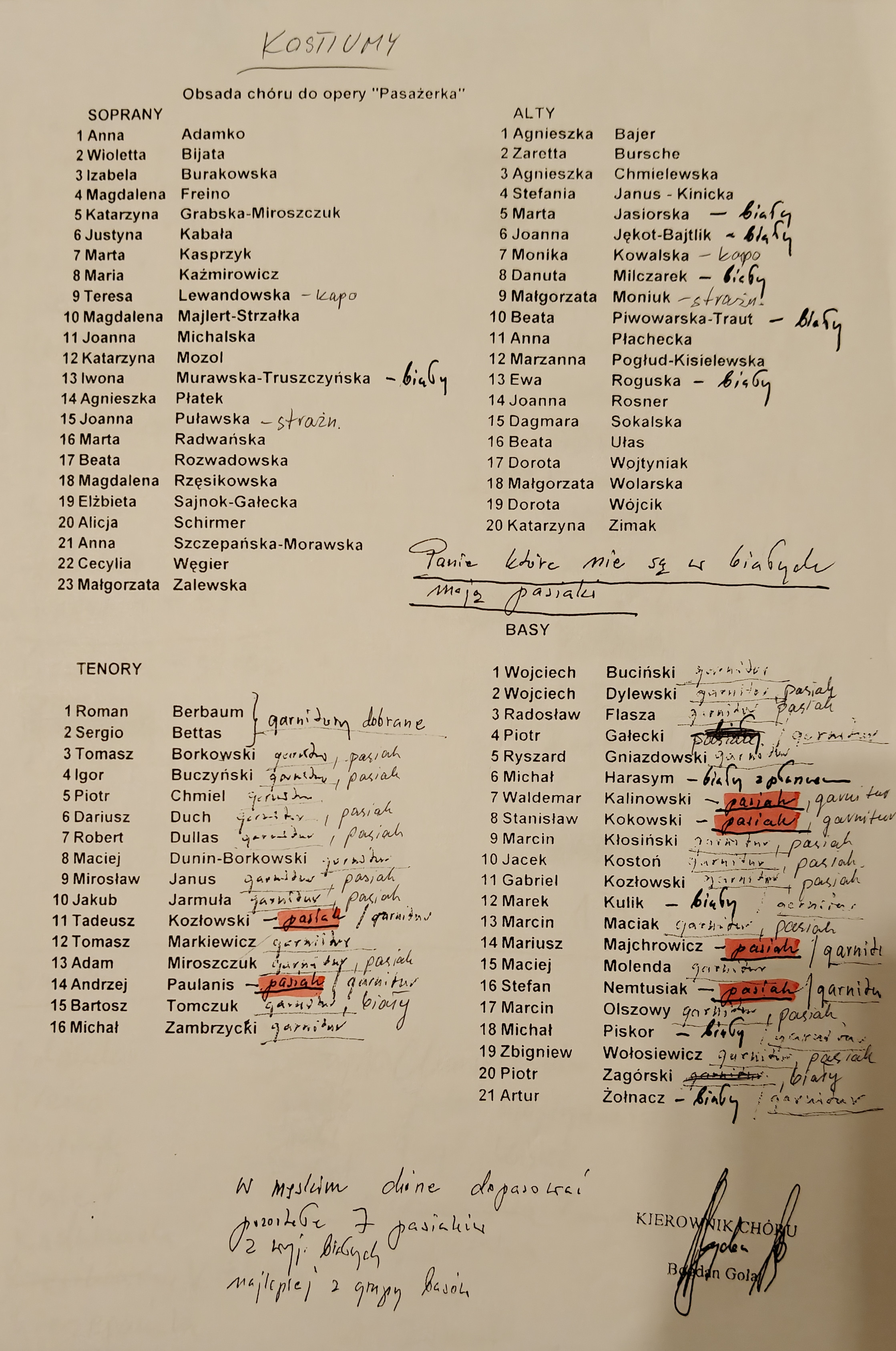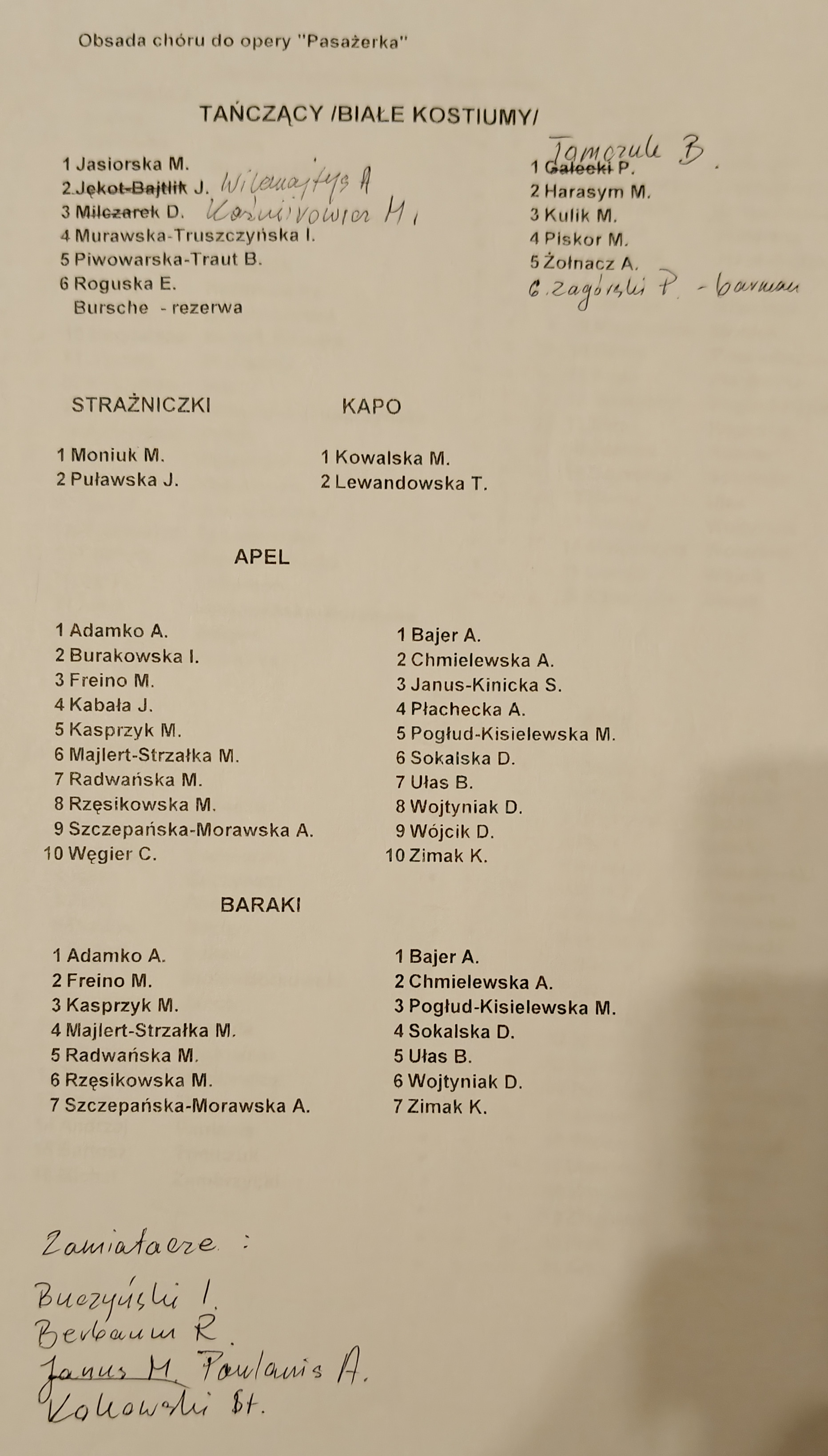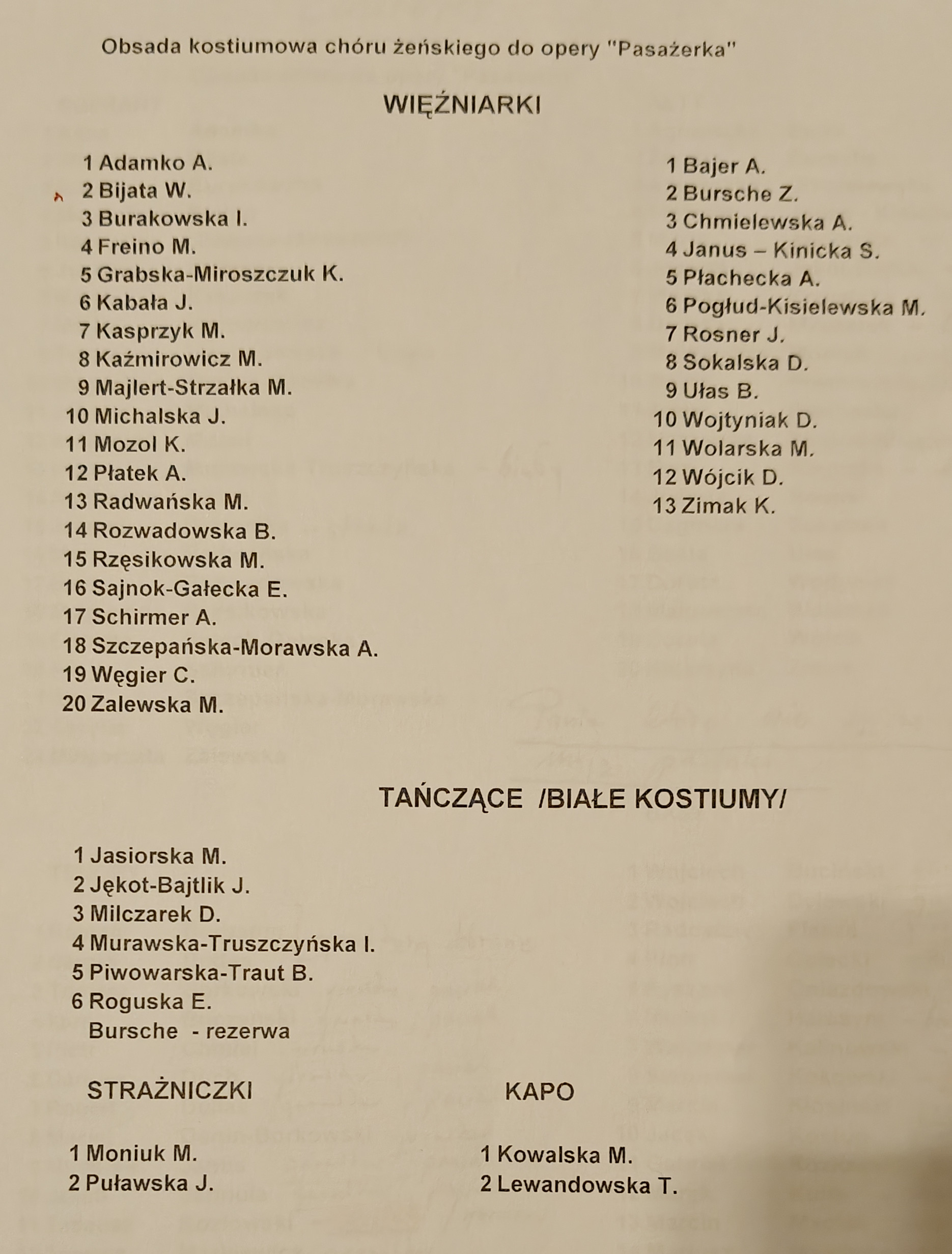 1. Bursche Z. 2. Jasiorska M. 3. Jękot-Bajtlik J. 4. Milczarek D. 5. Moniuk M. 6. Piwowarska-Traut B. 7. Płachecka A. 8. Roguska E. 9. Rosner J. 10. Wojtyniak D. 11. Wolarska M. 12. Bajer A. (2010) 13. Chmielewska A. 14. Janus S. 15. Kowalska M. 16. Pogłud-Kisielewska M. 17. Sokalska D. 18. Ułas B. 19. Wójcik D. 20. Zimak K. 21. Nowak E. (2016) KAPO (pasiak): 1. Kowalska M. STRAŻNICZKI (mundur): 1. Moniuk M. 2. Puławska J. |